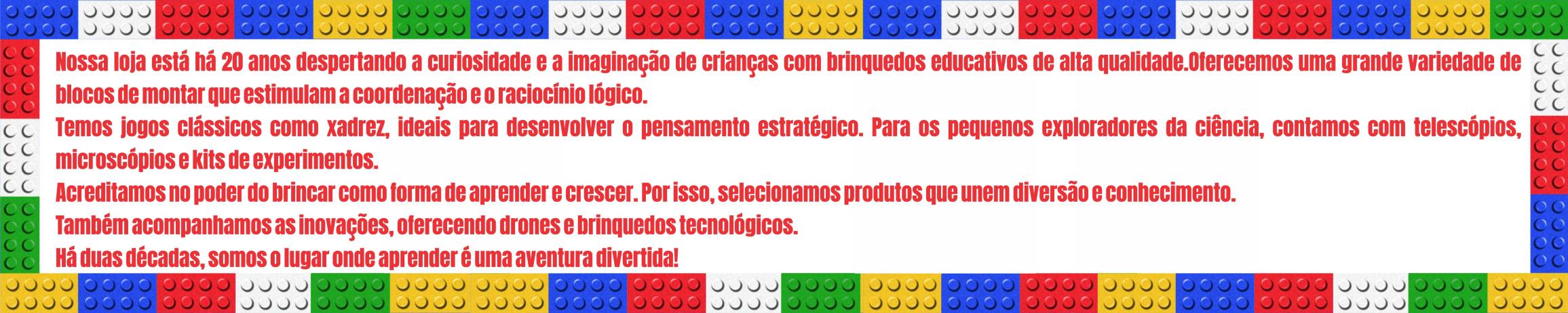 Há 20 anos no mercado, nossa loja é referência em brinquedos educativos que estimulam o aprendizado e a criatividade. Oferecemos desde blocos de montar até jogos clássicos como xadrez. Para os pequenos cientistas, temos telescópios, microscópios e kits de exploração. Também acompanhamos a tecnologia com drones e outros brinquedos inovadores. Aqui, brincar é sinônimo de descobrir e aprender!